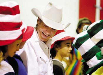 Country singer and former rodeo champion Chris LeDoux sits with Kaycee Elementary School students after reading a story during a 'Read Across America' event March 1, 2002. LeDoux died Wednesday from complications from liver cancer. Photo by Dan Cepeda/Casper Star-Tribune. |